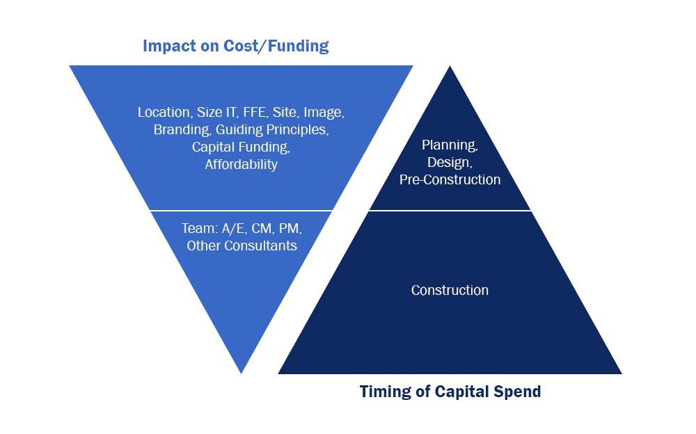 As we are specifically talking about design and preconstruction, decision-making during this phase of a major healthcare capital project is crucial because of its significant impact on project success, cost management, functionality, and stakeholder satisfaction. As shown in the image below, decisions made early in the process have the greatest impact on the overall project. However, the spending and cash flow related to project occurs much later.